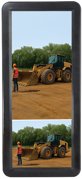Excavator monitors feature a vertical display format optimized for camera viewing angles on heavy equipment. They provide enhanced visibility for elevated and downward-facing views, improving operator awareness and control.
